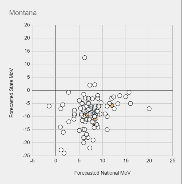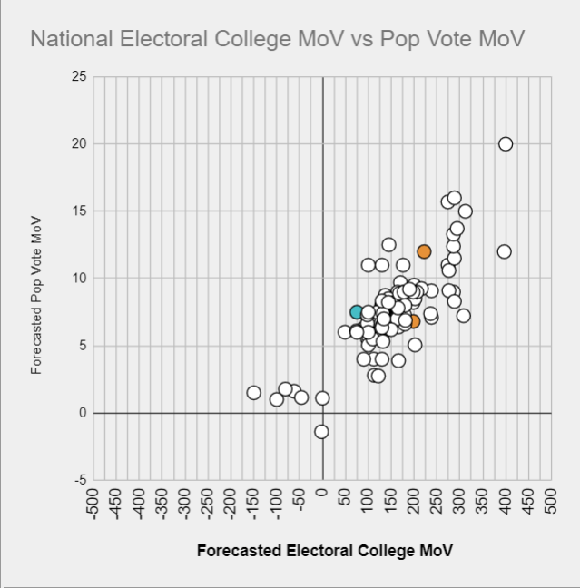 -When looking at national forecasts, the relationship between popular vote MoV and win probability is distorted by the electoral college
