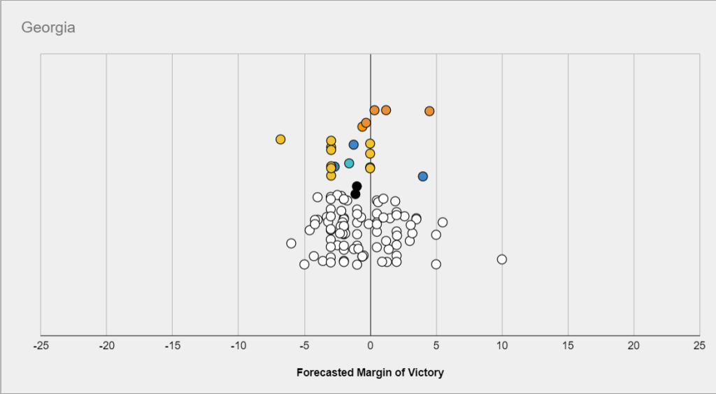 Since it so happens that all modelers agree on the general relationship between win probability and margin of victory (more specifically: so far no modeler has a substantially steeper or flatter curve than any other), it’s fairly straightforward to simply compare them on median forecast margin. Whoever gets closest did the best! (And this is why margins are the dominant scoring factor for my contest). This is wonderfully intuitive: if your forecast is calling for a close race, then the race ought to be close. If it’s a blowout, your forecast probably sucked.