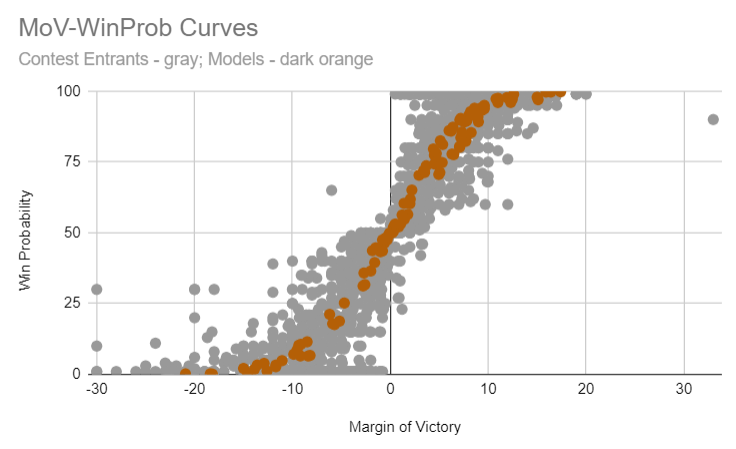 In this plot, each point is a particular state forecast (these span all states included in my 8/1 Contest). On the x-axis is the forecast margin of victory (from losing by 30 points to winning by 30 points) while the y-axis shows the win probability. There are two data types shown here: modelers are shown in dark orange, and individual contest entrants (humans) are shown as grey points.